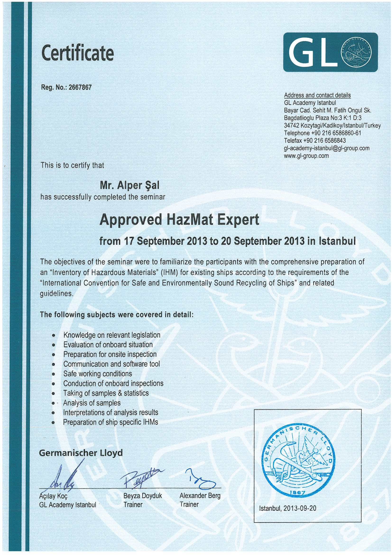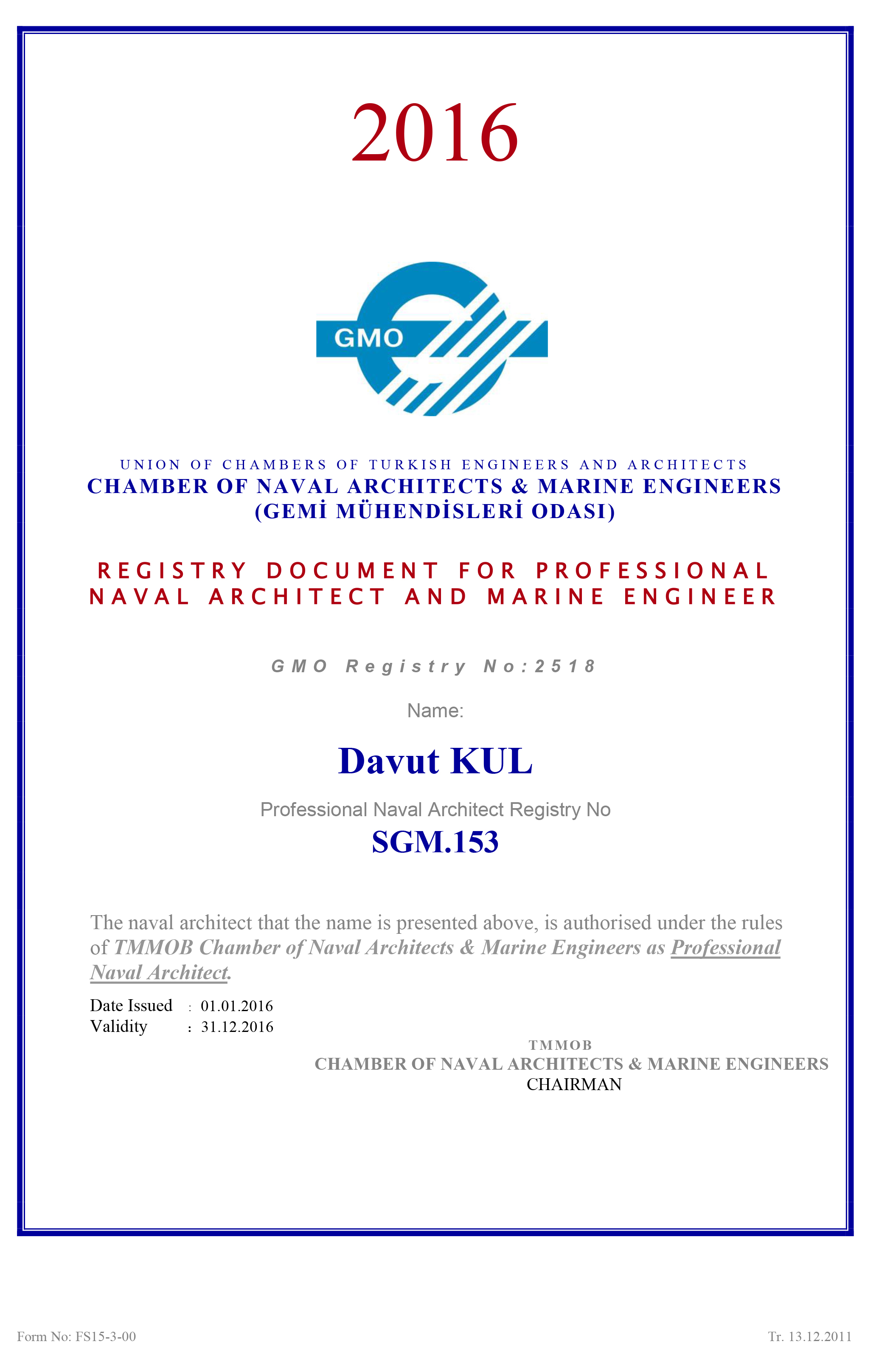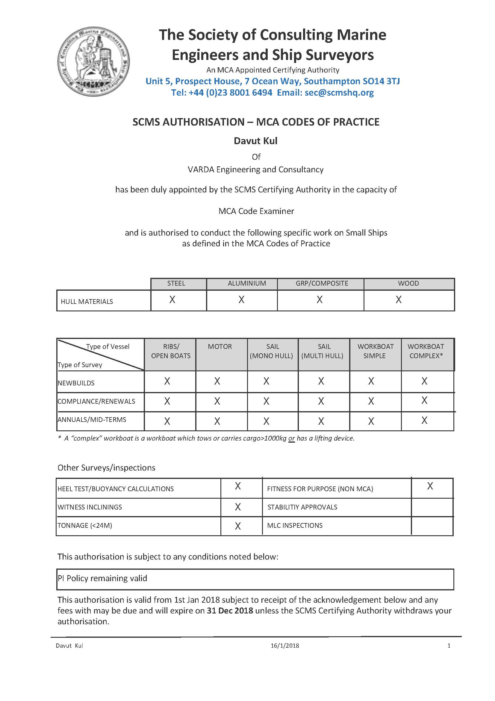 Accredited Marine Surveyor MIIMS Davut KUL certificates