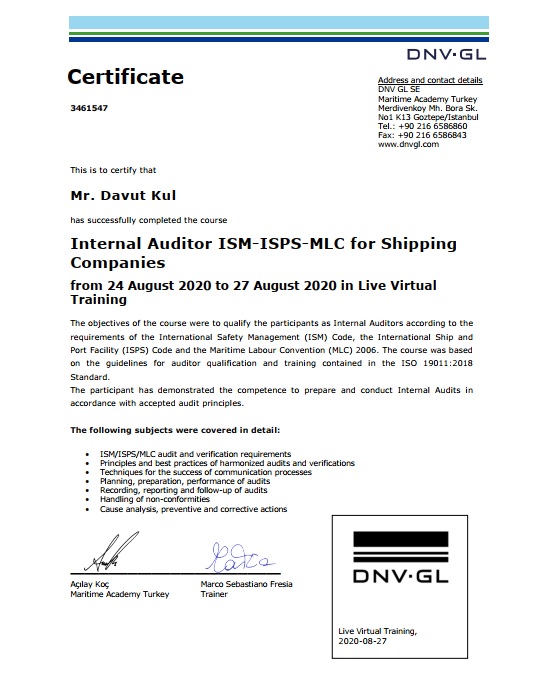 Davut_Kul_Internal Auditor ISM-ISPS-MLC_Certificate
