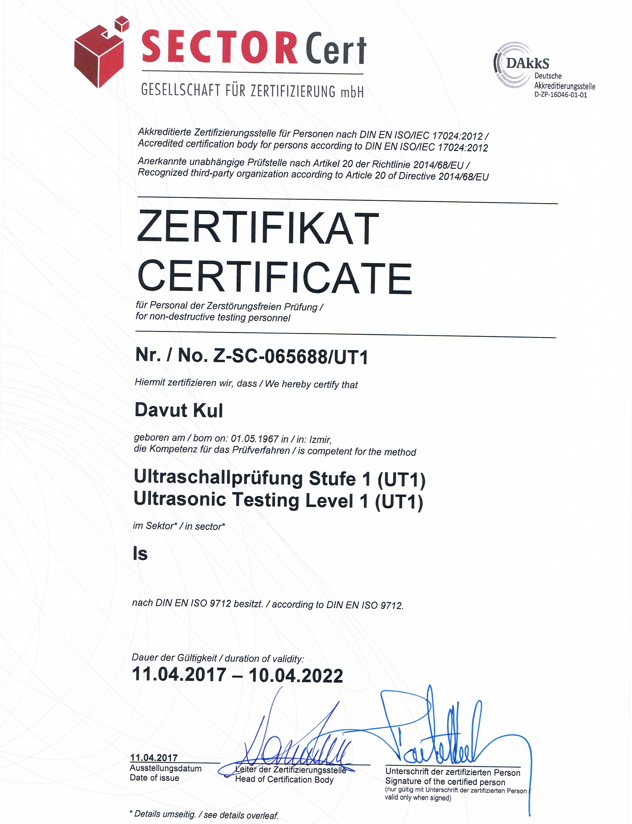 Davut KUL NDT Certificate UT1 Ultrasonic Test Level 1